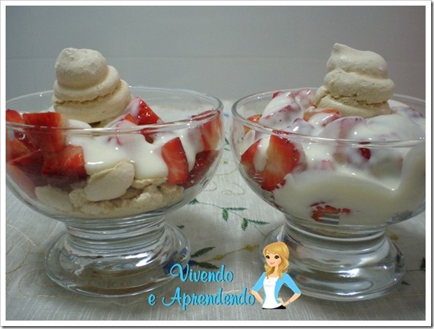 E por fim, a sobremesa! Servi Suspiros de Morango (clique no link para ver a receita), mas nesta versão substituí o chantilly da receita original por creme de leite. Adicionei ao creme de leite 2 colheres (sopa) rasas de açúcar e misturei até ficar um creme homogêneo.